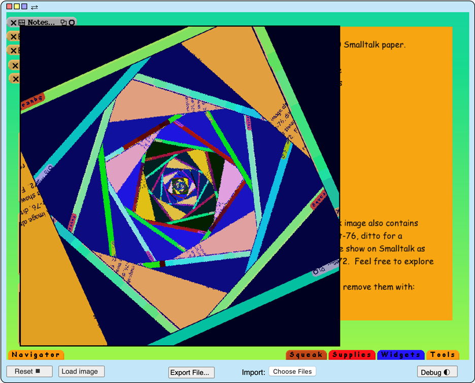 By the mid-1980s, Kay, like other ex-PARC colleagues Larry Tesler and Dan Ingalls, had joined Apple. In 1995, after a hiatus from the computer industry, Ingalls rejoined Kay’s group to produce a new, portable version of Smalltalk derived from the free Apple Macintosh version. Called “Squeak,” this version supported full color and contained many improvements, including an updated version of the BitBLT routine called “WarpBlt” that supported rotation and scaling effects. A cool example of WarpBlt can be found here. Squeak also supported a new effort to make a children’s educational computing environment, eToys. eToys can be run here. Squeak was released as open source in 1996, and remains in active development today. Thanks to Vanessa Freudenberg’s SqueakJS (an implementation of Squeak in JavaScript), you can now run most versions of Squeak in the Smalltalk Zoo here.