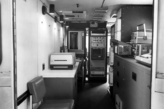 Packet radio equipment in racks; van interior looking backward.