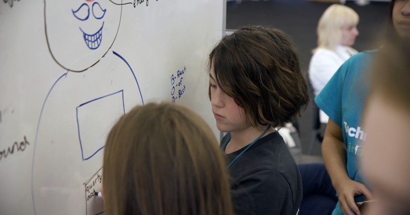 A Technovation Challenge finalist begins the brainstorming process, listing ideas, and features for her group’s robot during CHM’s Design the Future workshop.