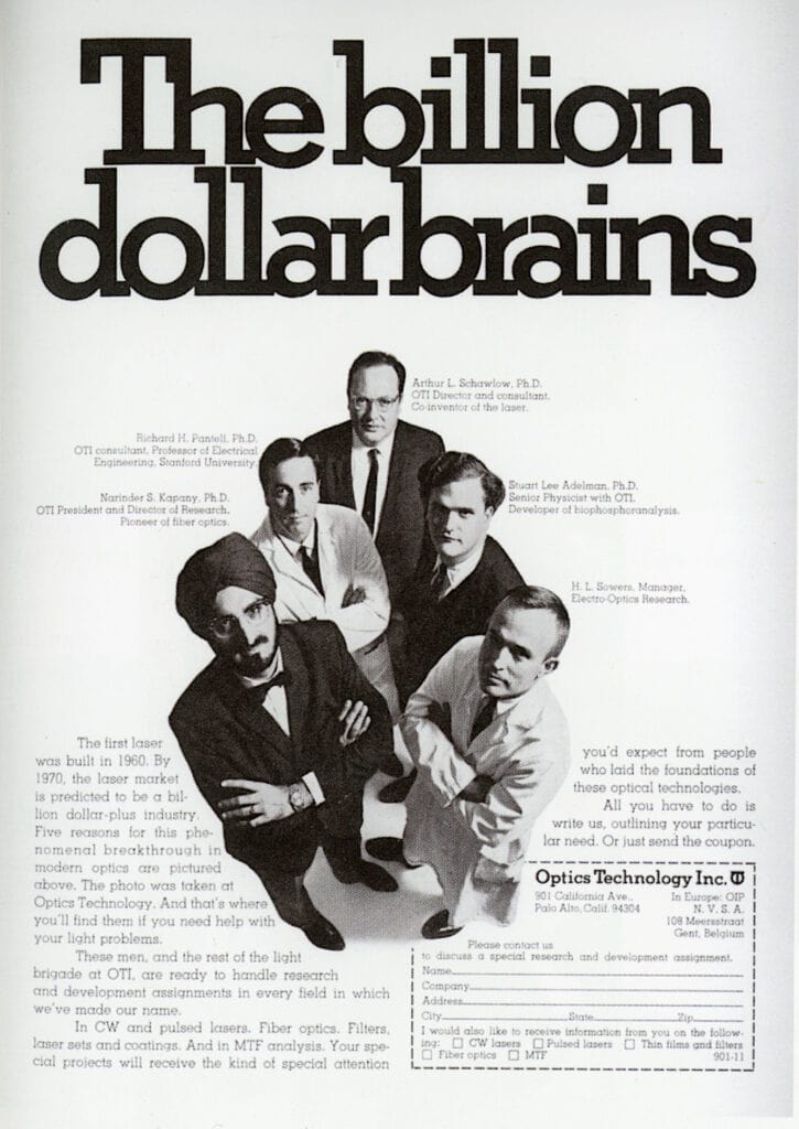 In 1960, Kapany founded Optics Technology, Inc. (OTI), in California, one of the first companies to commercialize fiber optic products. OTI made lenses, coatings and endoscopes for industrial and military markets and took the company public in 1967. Some of Silicon Valley’s very first and ultimately most influential venture capitalists provided early funding for OTI, including William Draper, Irwin Fetterman, and Tom Perkins.