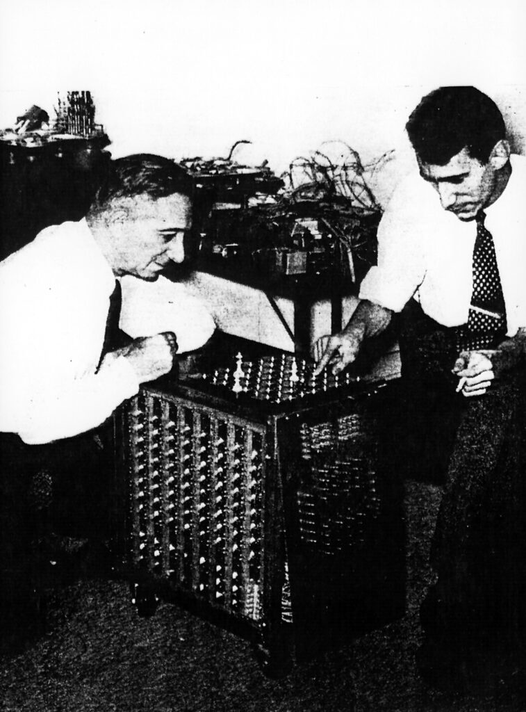MIT and Bell Labs researcher Claude Shannon (right) developed modern information theory and published the first article on how to write computer chess programs in 1950. He also built this chess machine (pictured) at MIT using relays. Chess champion Ed Lasker at left. ca. 1950. Gift of Monty Newborn, Collection of the Computer History Museum, 102645398.