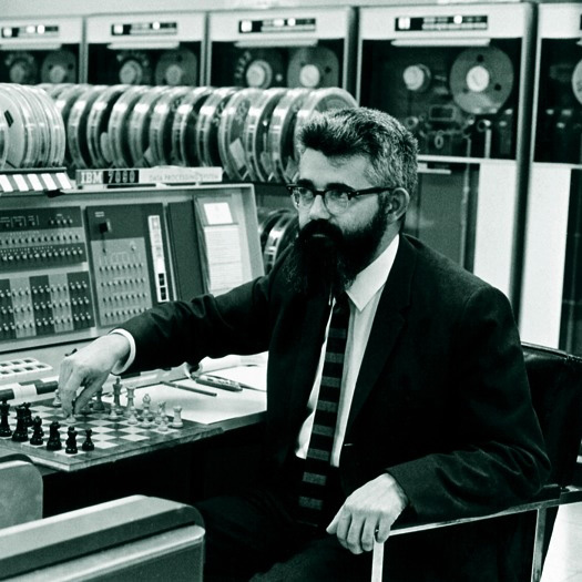 John McCarthy playing chess at Stanford’s IBM 7090. McCarthy used an improved version of the Kotok program to play correspondence chess against a Soviet program developed at the Moscow Institute for Theoretical and Experimental Physics (ITEP) by George Adelson-Velsky and others. In 1967, a four-game match played over nine months was won 3-1 by the Soviet program. Courtesy of Stanford University.