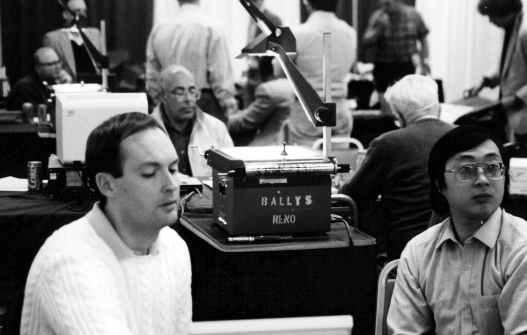 Hans Berliner (rear), Murray Campbell (front, left) and Feng-Hsiung Hsu at the 20th annual ACM Computer Chess Championship in Reno, Nevada. Two teams—HiTech (Berliner’s team) and Deep Thought (Campbell and Hsu’s team)—both from Carnegie Mellon University, tied for first place. Three members of the Deep Thought team (including Campbell and Hsu) were later hired by IBM to create Deep Blue. Collection of the Computer History Museum, 102645329.