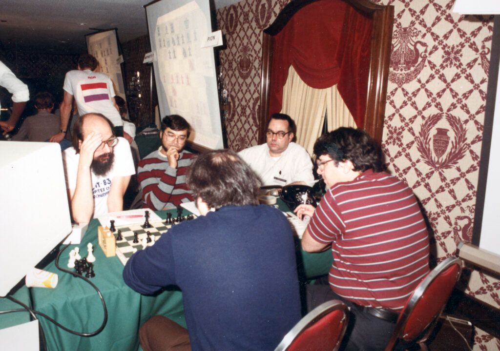 Belle faces off against Chess 4.0 at the 4th World Computer Chess Championship in New York City in 1983. Shown from left, back are: Ken Thompson, Feredric Friendel, and Joe Condon. From left, front: Chess co-developers David Slate and William Blanchard. Supercomputer-based chess program Cray Blitz won the tournament, followed by Bebe. Gift of Monty Newborn, Collection of the Computer History Museum, 102645364.