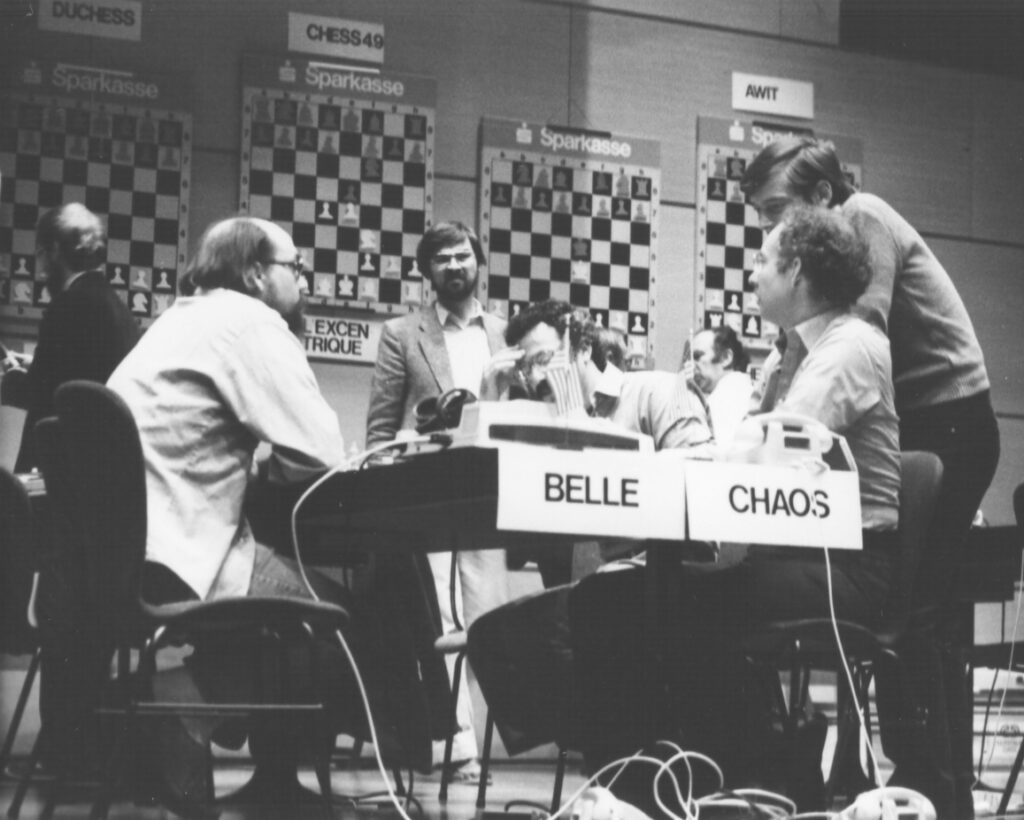 During the 1980s, Belle, developed by Ken Thompson and Joe Condon at Bell Labs, was a strong competitor at chess tournaments. Shown here are chess programs Belle and CHAOS at the 1980 WCCC in Linz, Austria, where Belle played University of Michigan’s CHAOS in a closely matched competition and won. Collection of the Computer History Museum, 102645444.