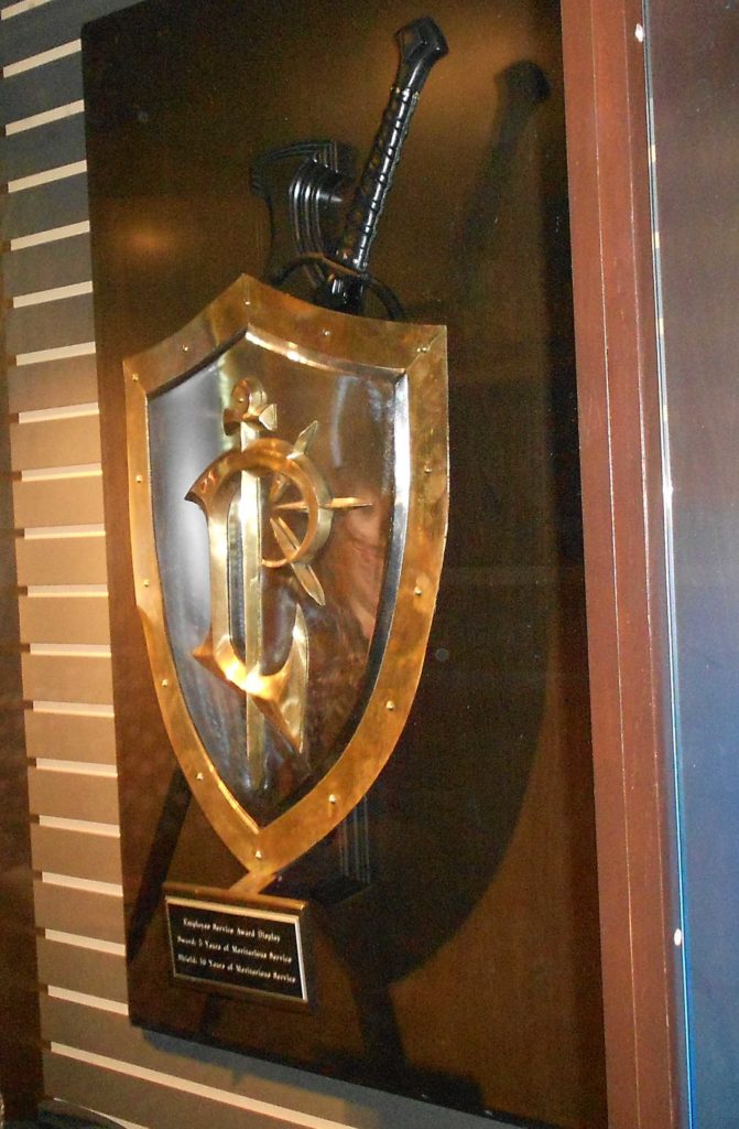 Life-size Lordaeron shield and sword, wielded in-game by Stormwind guards, are Blizzard’s five and ten year service awards.