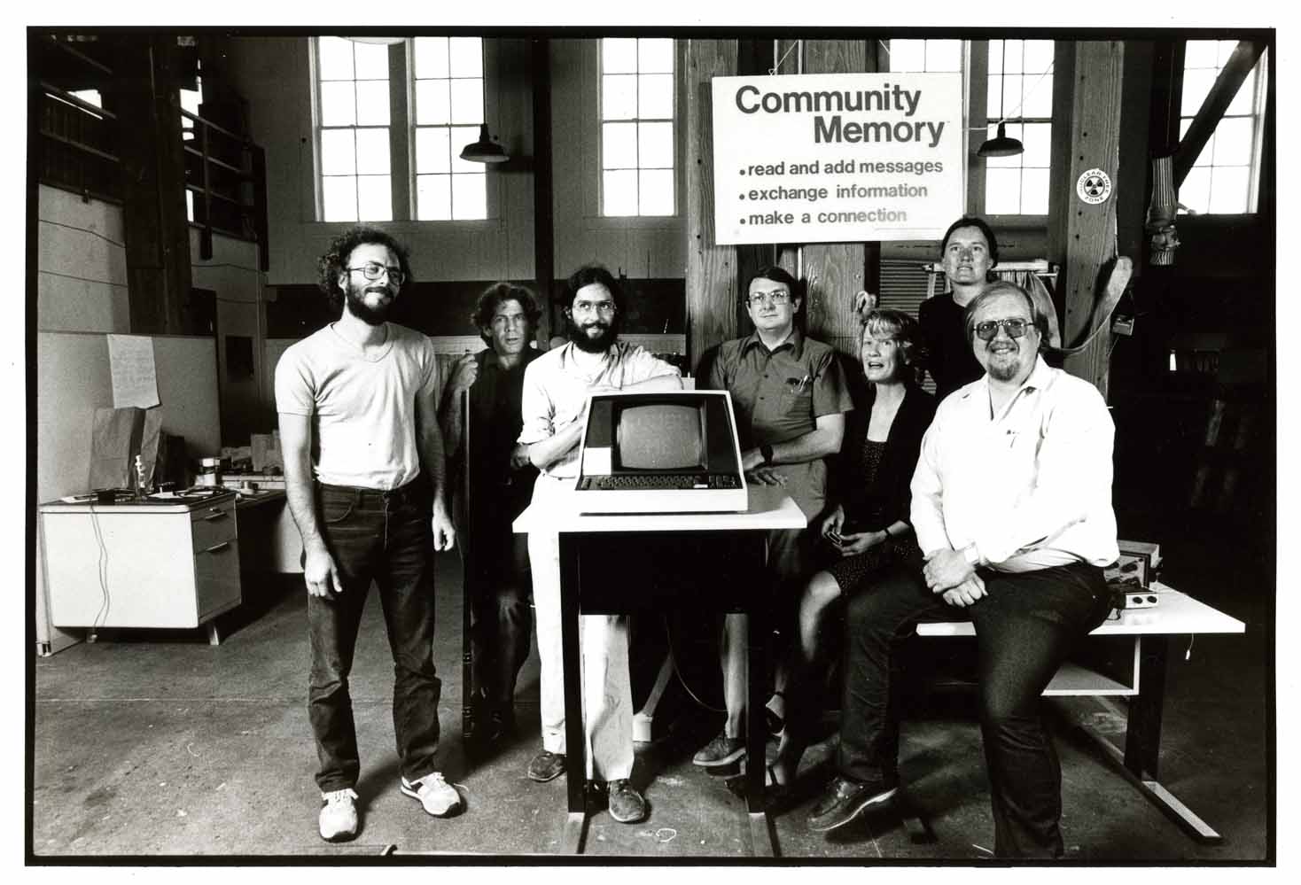 Figure 4. Community Memory group photograph with terminal, 1984, Lee Felsenstein Collection, Digital Archive, Catalog 102702620. From left to right, Carl Farrington, Michael Rossman, Phil Kohn, Lee Felsenstein, Karen Paulsell, unknown woman, Ken Constad.