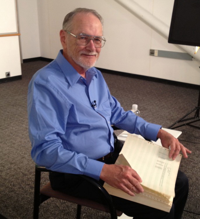 Paul Laughton examining the Apple II DOS source code listing in August 2013