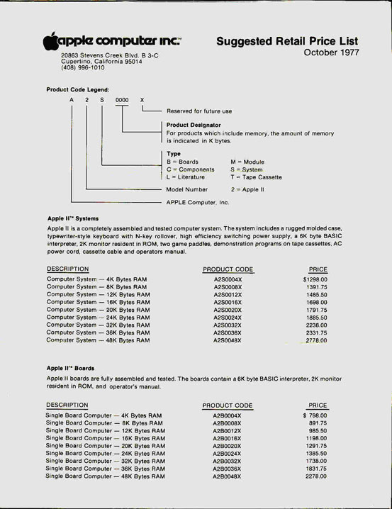 The MSRP list for Apple II machines. Prices ranged from $798 for a standalone board with 4KB RAM to $2,770 for a fully-assembled computer with 48KB RAM.