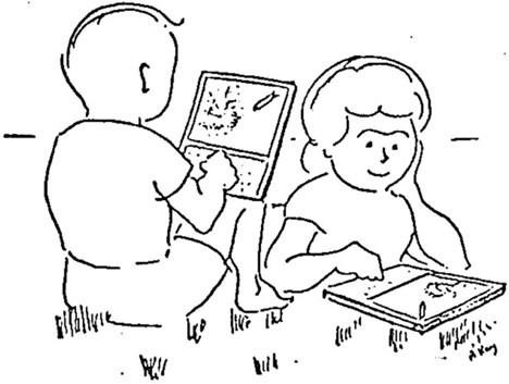 Cartoon of two children using their Dynabooks, drawn by Alan Kay. From “A Personal Computer for Children of All Ages,” by Alan Kay, Xerox PARC, 1972.