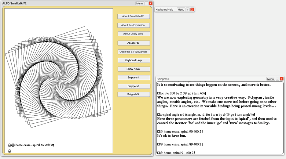 By the mid-1980s, Kay, like other ex-PARC colleagues Larry Tesler and Dan Ingalls, had joined Apple. In 1995, after a hiatus from the computer industry, Ingalls rejoined Kay’s group to produce a new, portable version of Smalltalk derived from the free Apple Macintosh version. Called “Squeak,” this version supported full color and contained many improvements, including an updated version of the BitBLT routine called “WarpBlt” that supported rotation and scaling effects. A cool example of WarpBlt can be found here. Squeak also supported a new effort to make a children’s educational computing environment, eToys. eToys can be run here. Squeak was released as open source in 1996, and remains in active development today. Thanks to Vanessa Freudenberg’s SqueakJS (an implementation of Squeak in JavaScript), you can now run most versions of Squeak in the Smalltalk Zoo here.