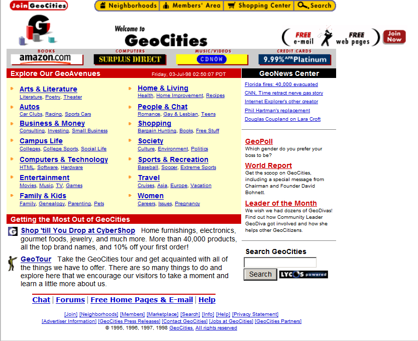 In 1997 the site counted a million users, dubbed “Homesteaders.” The next year GeoCities went public at a value of $86 million; it was one of hot IPOs of an increasingly frenzied dot-com boom. Bohnett used the money to add a number of features including a search engine and an evolving set of tools and templates which made it increasingly easy to create your own pages—no HTML skills required. Social tools made it easy for users to interact. Besides personal pages there was also business hosting, world news, shopping, and more.
