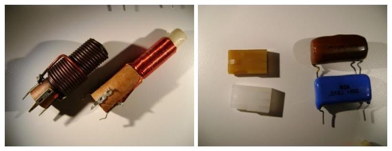 Left: Overheated and good inductors. Right: Overheated (top) and replacement components (bottom).