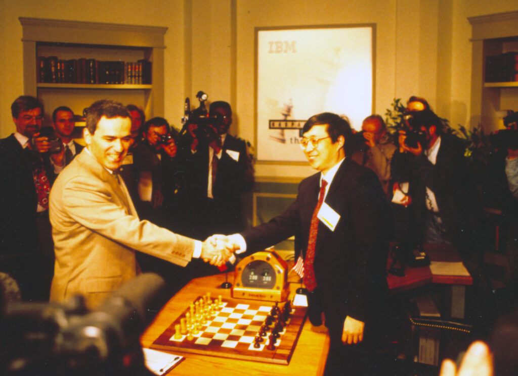 Garry Kasparov shakes hands with Feng-Hsiung Hsu at game 1 of 1997 Deep Blue vs. Kasparov re-match in New York City, New York. Gift of Monty Newborn, Collection of the Computer History Museum, 102645300.