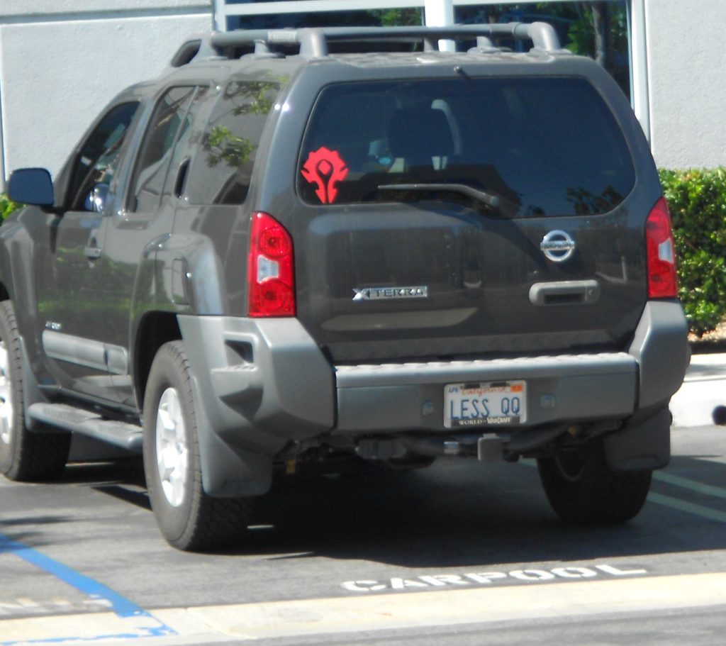 A few of the cars parked at the Blizzard headquarters had vanity plates referencing World of Warcraft. This one shows part of the phrase “LESS QQ MORE PEW PEW,” roughly translated, “Less crying, do more damage.”